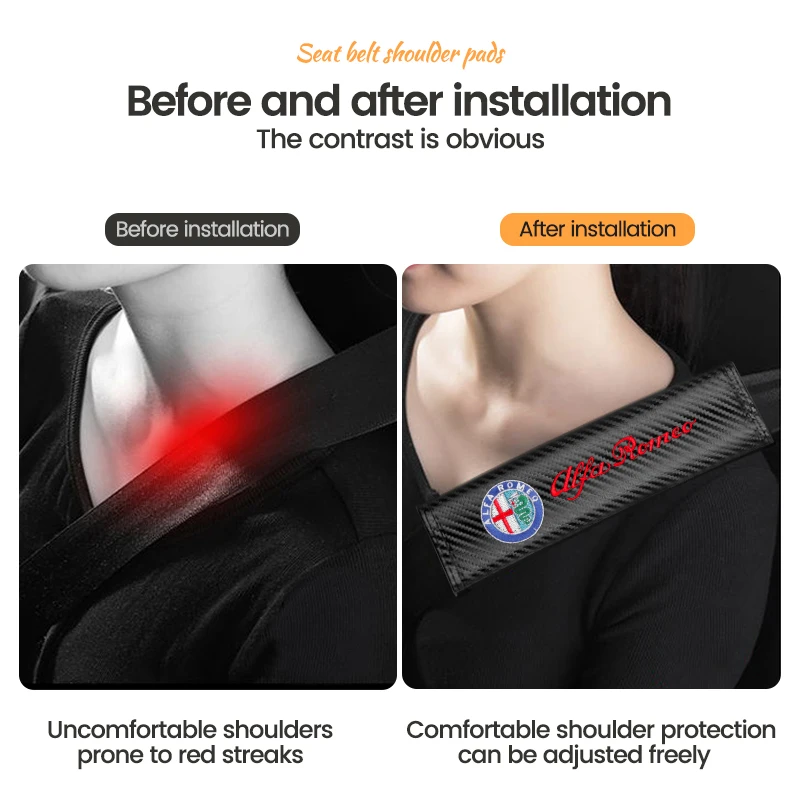 Enhance your driving comfort with these luxurious seat belt shoulder pad protectors, designed specifically for Alfa Romeo Giulia, Stelvio, Giulietta, 156, 159, 147, Mito, Tonale, and more. Crafted for both style and function, these soft, padded covers eliminate seat belt discomfort while adding a touch of elegance to your car’s interior.